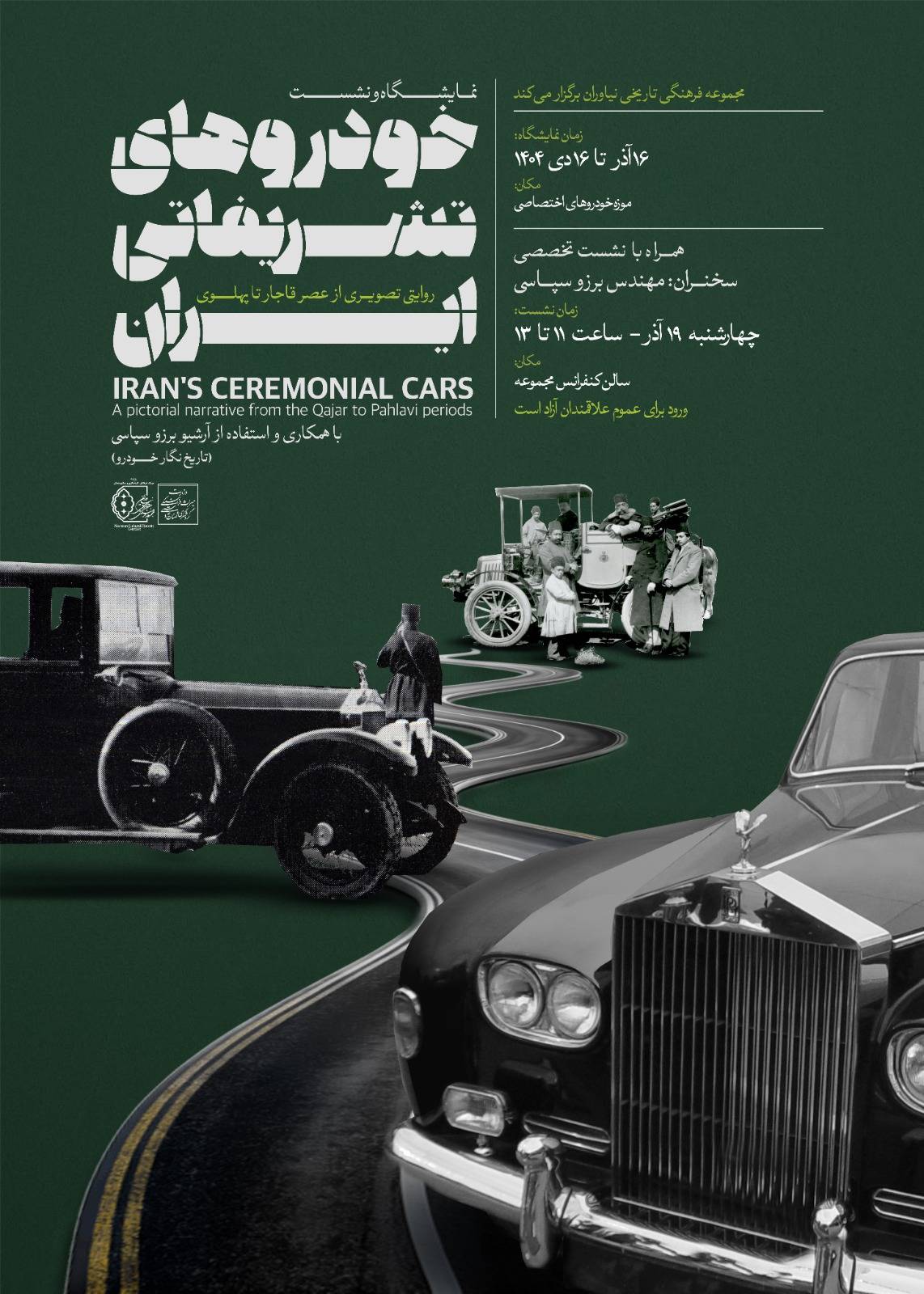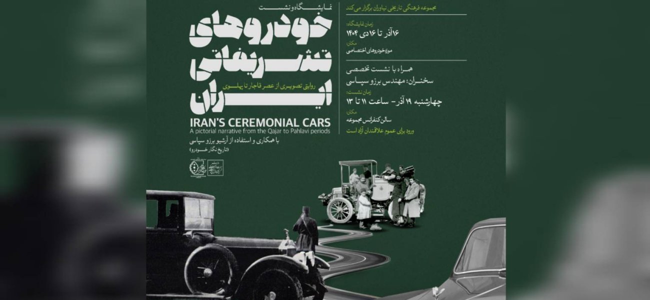 به گزارش روابط عمومی مجموعه فرهنگیتاریخی نیاوران؛ این نمایشگاه که با بهرهگیری از تصاویر و اسناد تاریخی از آرشیو برزو سپاسی، تاریخنگار و پژوهشگر حوزه خودرو، به بررسی سیر تحول خودروهای تشریفاتی در دربار ایران از دوره قاجار تا پایان عصر پهلوی میپردازد از 16 آذر تا 16 دی در موزه خودروهای اختصاصی نیاوران برگزار می شود.